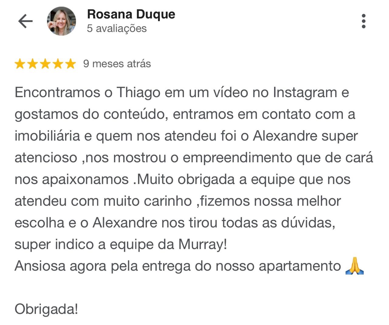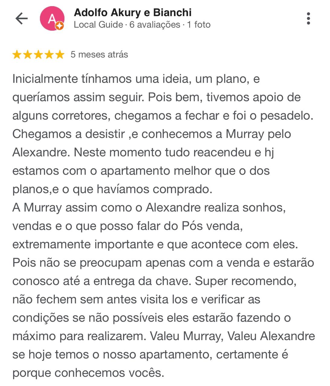 Publicado em Thiago dos Santos08/10/2025Trustindex verifica se a fonte original da avaliação é Google. Eu e minha futura esposa Juliana gostaríamos de agradecer a Murray Lançamentos Imobiliários, principalmente o corretor VINÍCIUS pelo excelente atendimento e dedicação em todo o processo da compra do nosso primeiro apartamento. Sempre atencioso, transparente e disposto a ajudar em cada etapa. Não desistiu de nós em nenhum momento e se dedicou ao máximo para encontrar o que poderemos chamar de lar! Ele tornou essa conquista muito mais tranquila e especial. Somos muito gratos por todo o apoio e profissionalismo!Publicado em Rosana Souza04/10/2025Trustindex verifica se a fonte original da avaliação é Google. Gostaria de contar um pouco da minha experiência com a Murray Lançamentos. Iniciamos o contato através de um anúncio do Instagram e rapidamente o consultor Helio nos retornou, sempre muito atencioso, prestativo e com transparência em cada etapa. Foi muito importante nesse momento ter um profissional capacitado como ele e que tornou todo o processo e experiência a mais tranquila possível e segura, pois nos deu segurança e confiança em cada passo do nosso processo, que finalizou com a aquisição do nosso tão sonhado apartamento na praia. Helio, novamente gostaria de agradecer por todo suporte e ajuda em nosso processo, você foi essencial na realização do nosso sonho. 🙏🏻 A Murray lançamentos, deixo aqui os meus parabéns por toda estrutura, organização e comprometimento que é oferecido ao cliente e seus funcionários, excelentes profissionais são resultados de uma excelente gestão. 🎉Publicado em Hipólito Hipólito01/10/2025Trustindex verifica se a fonte original da avaliação é Google. Fomos muito bem atendidos pela corretora Giulia, sempre muito prestativa, atenciosa e muito profissional.Publicado em Glaucia Valieri30/09/2025Trustindex verifica se a fonte original da avaliação é Google. Fomos.muito bem recebidos pelo vendedor Vinicius, nos deixou bem claro sobre empreendimento ,atencioso eu e meu marido fomos.muito bem recebidos e estamos.felizes cin a.compra do apartamento do valparaiso ,recomenda a Murray e vendedor Vinicius.Publicado em Reinaldo Costa30/09/2025Trustindex verifica se a fonte original da avaliação é Google. A experiência até o momento está sendo ótimo vendedor Vinícius muito receptivo educado deixa bem claro a proposta do empreendimento gostamos muito do atendimento dele e recomendoPublicado em Pedro Oliveira29/09/2025Trustindex verifica se a fonte original da avaliação é Google. Foi e está sendo uma experiência maravilhosa. O vendedor, Vinicius, é um excelente profissional e a estrutura da Murray ótima. Estamos muito felizes com a compra do imóvel.Publicado em Leandro Lemos20/09/2025Trustindex verifica se a fonte original da avaliação é Google. Realizar o sonho de ter um empreendimento na praia não é apenas sobre investir — é sobre conquistar qualidade de vida, liberdade e um pedacinho do paraíso para chamar de seu. Mas transformar esse sonho em realidade exigia mais do que vontade — exigia confiança. E foi aí que entrou o corretor VINÍCIUS, um profissional que fez toda a diferença nessa jornada. Com transparência, conhecimento do mercado e um atendimento que vai além da venda, ele me ajudou a encontrar o lugar certo, na hora certa. Mais do que um corretor, ele foi um parceiro estratégico. Me deu segurança em cada passo, esclareceu dúvidas, apresentou oportunidades incríveis e, principalmente, respeitou o meu tempo e o meu sonho. Parabéns CORRETORA MURRAY 👏 OBRIGADO AO CORRETOR VINÍCIUSPublicado em Paloma Perez20/09/2025Trustindex verifica se a fonte original da avaliação é Google. Kamila Essa profissional... Dedicada,simpática,solicita. Muito obrigada por ajudar a realizar mais esse sonho. Parabéns pelo seu trabalho e sua dedicação Muito sucesso sempre.Publicado em Carla Mätos15/09/2025Trustindex verifica se a fonte original da avaliação é Google. Fui atendida pelo Vinicius que foi super prestativo e atencioso. Não moro em SP, moro em outro estado e isso não foi nada de empecilho, muito pelo contrário, ele me orientou e ajudou da melhor maneira possível, mesmo de longe!Publicado em thiago martins da silva12/09/2025Trustindex verifica se a fonte original da avaliação é Google. Atendimento top , fomos atendido pelo Marcos Toyama , muito educado , tirando todas nossas dúvidas , nos auxiliou né todos os quesitos , bem transparente , super indico !!!Carregue mais